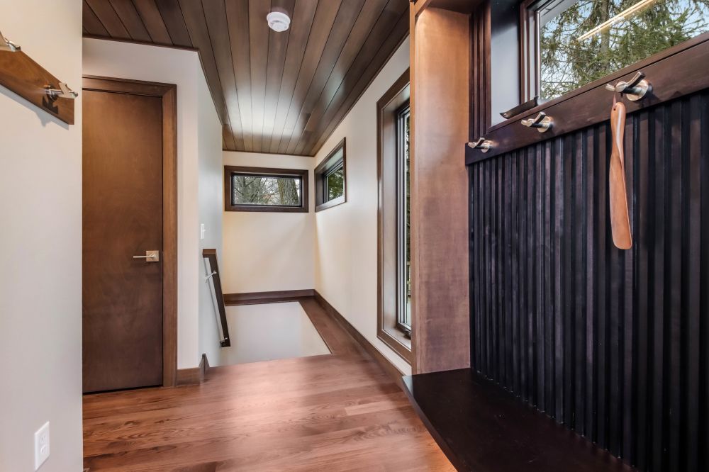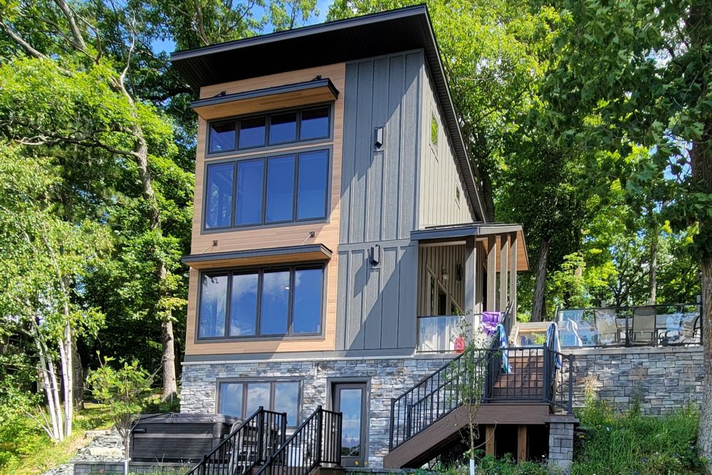 Nearly invisible from the road, this hidden lot provided the homeowners with years of great memories. When it was time to rebuild, they tasked R. Tews with developing a more functional home for entertaining, while keeping within the footprint of the original structure. With three levels, this 2094 square foot home lives much larger than it looks. The upper-level master suite has phenomenal views of the water, with more glass than wall! The main floor gathering area has kitchen designed for entertainment, with a beautiful plaster fireplace, and hide-away TV. Easy access to the grilling patio makes indoor-outdoor summer living a breeze. The basement incorporates a full wet bar with ice-maker, as well as a fully tiled bathroom and polished concrete floors to hold up to wet guests coming in from the lake or hot tub. With a mixture of modern aesthetics, and natural textures, both the interior and exterior of this home are relaxed, yet contemporary.